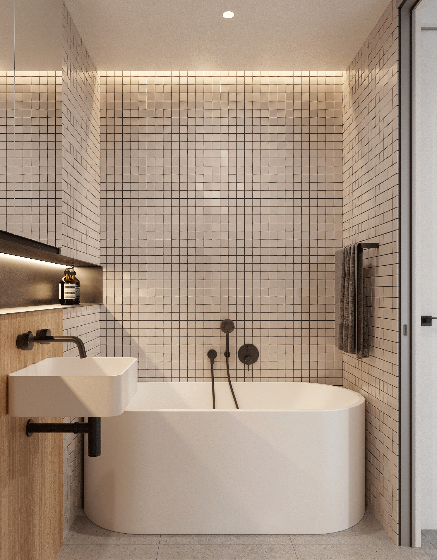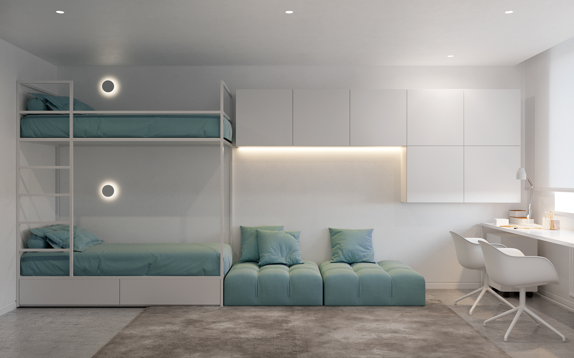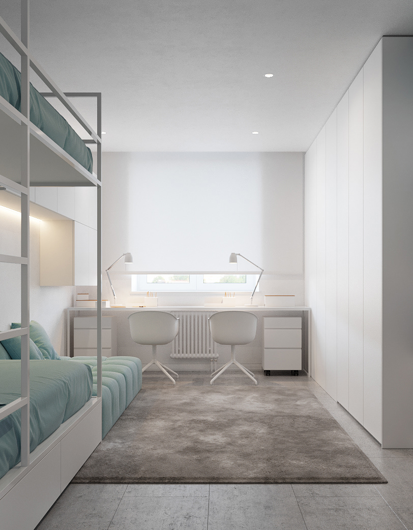 A playful yet functional design that combines a shared bedroom and bathroom into a cohesive kids’ suite. Custom bunk beds, integrated desks, and ample storage maximize space while keeping the room bright and adaptable. The adjoining bathroom continues the clean, modern aesthetic with warm timber accents, tiled walls, and soft lighting, creating a space that balances practicality with comfort and fun.