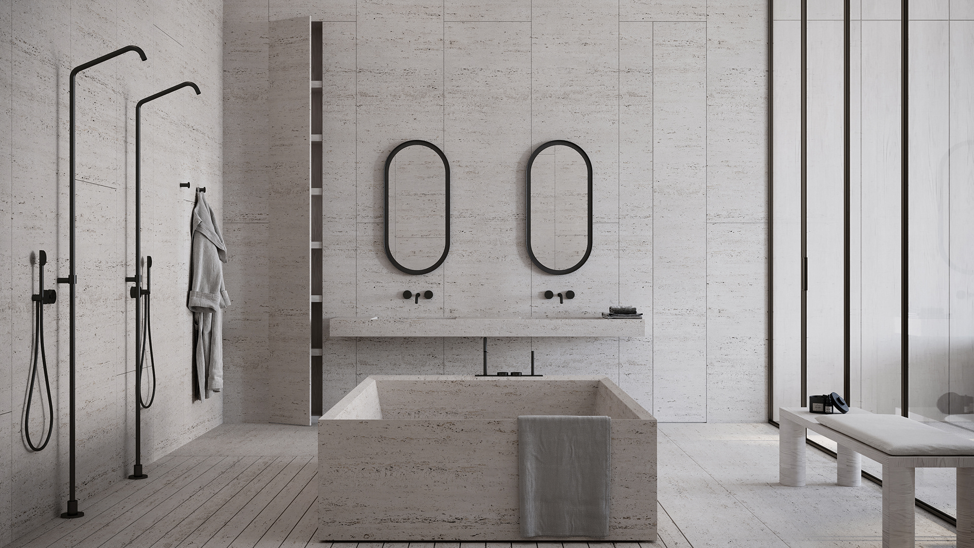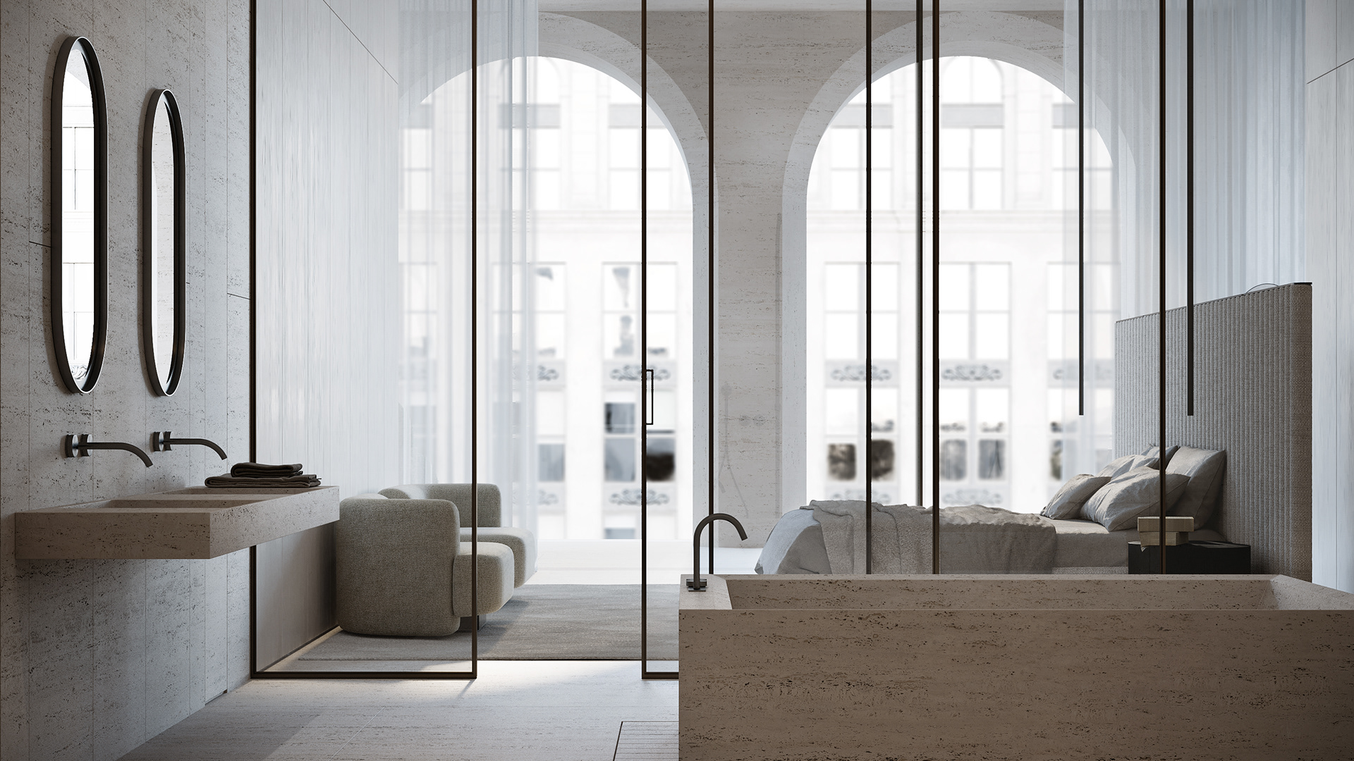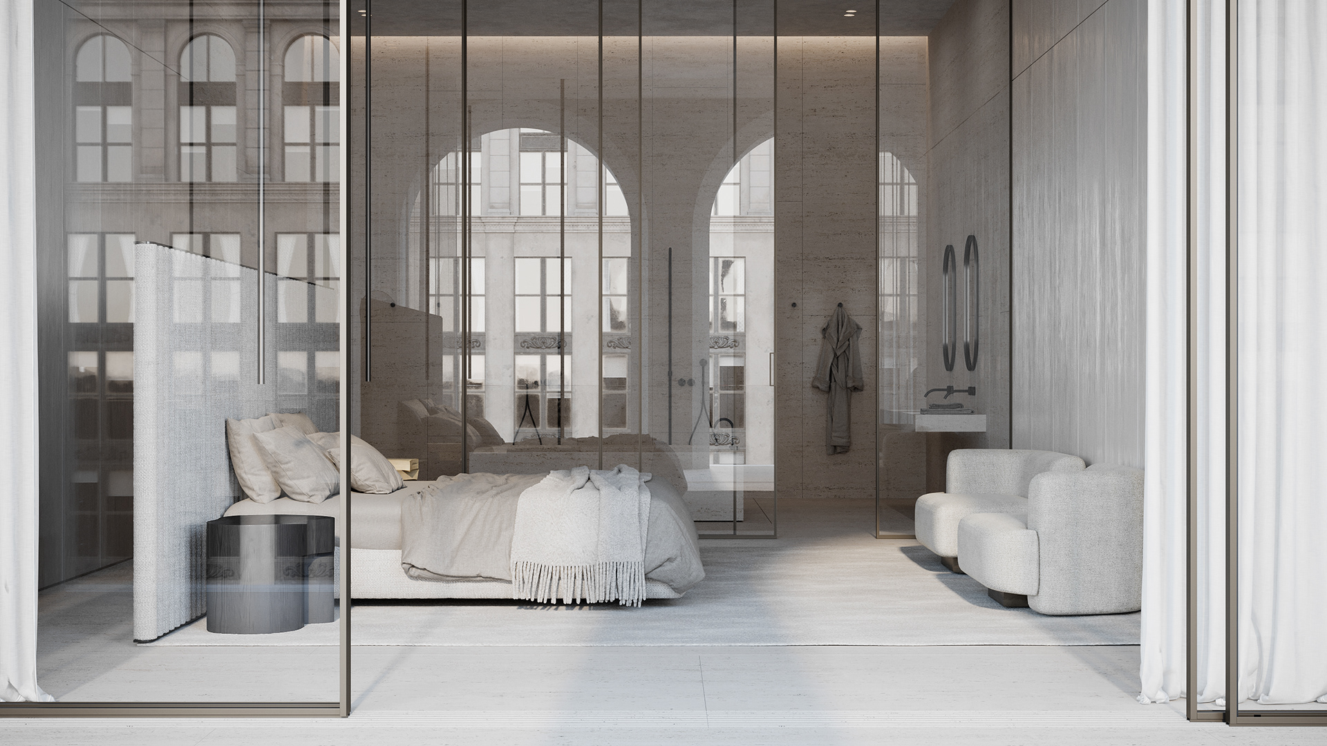 Conversion of a former warehouse in Balmain into a contemporary residential home, blending industrial character with modern design elements to create a functional and stylish living space. Concept design for an interior of refined minimalism, balancing natural stone, timber, and sculptural forms in calm harmony.